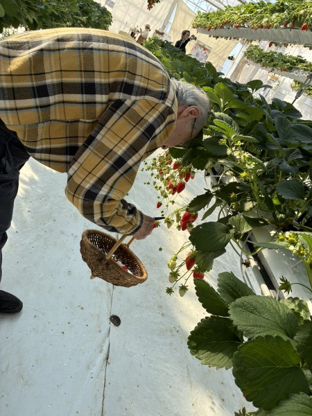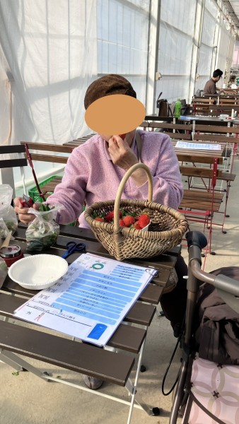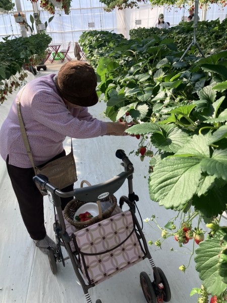 大粒で真っ赤に熟したいちごを、真剣かつ鋭い眼差しで吟味される入居者様。
