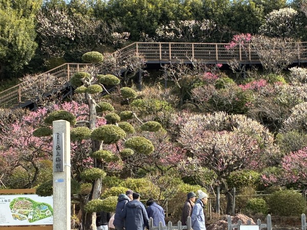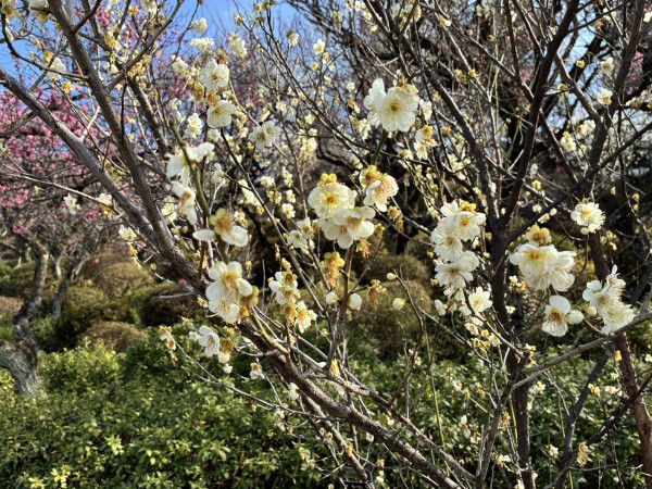 青空の下、紅梅や白梅の他、たくさんの種類の梅がほころび始めていました。